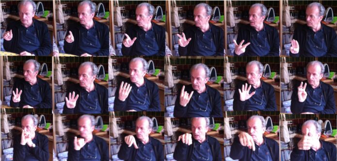 Another reason why it struck me, was that as a newcomer, the three voices were so resonant, and my ears were so attuned to overtones, that the richness overwhelmed and intoxicated me. Later, when listening to album recordings of Corsican polyphony, I sometimes could not tell how many parts there were. I might believe I was hearing 5 singers when in fact there were only three. And even I saw there were just three singers, I had a hard time catching everything that was happening. In the live sitation, onstage or during practise in Pigna, there was someone for whom all these parts were so transparent, that he had the mental space to create his own line on the spot as well as the two others, and use hand gestures to direct them. Nando did that without visible effort: he had a certain softness in his facial expressions, and a fluency in the way his hands and arms moved. During one visit, I asked him to show me how he used it, and we made photographs of each hand sign. (Unfortunately, I cannot find any video where we see the mimofonia live in action).